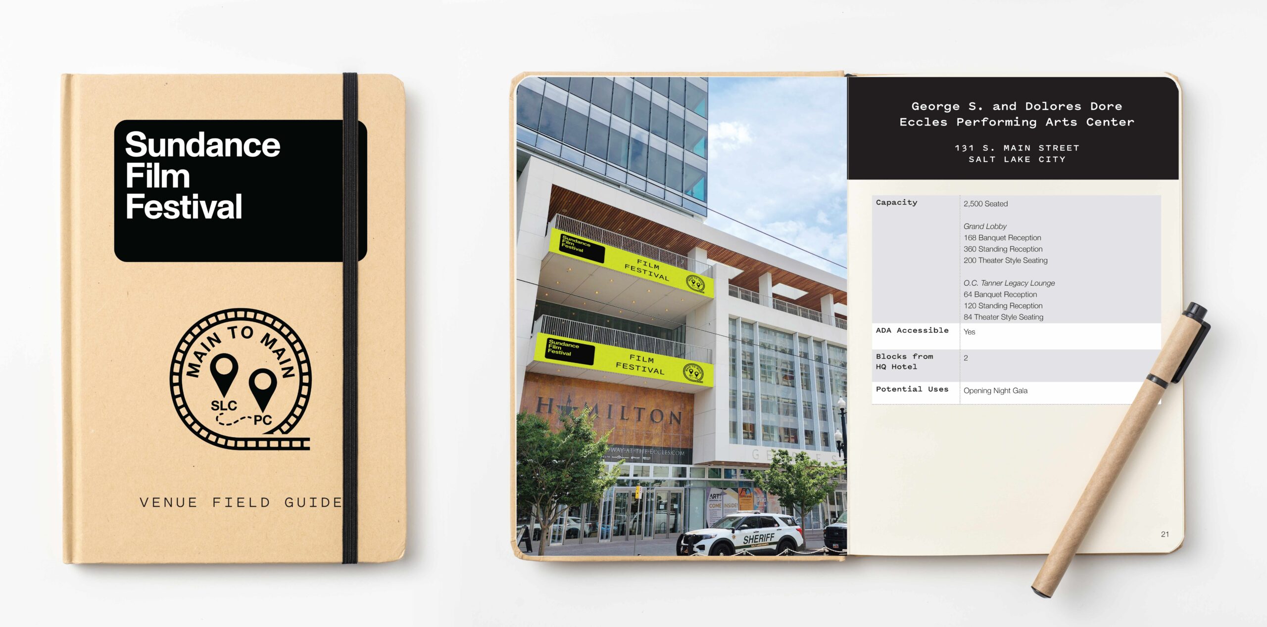 One of the ways this theme was showcased was in a logo featuring two points connected by a path surrounded by film reel. This logo was used in connection with photographs of Park City’s Main Street and Salt Lake’s Main Street. Other collateral included street flags, agenda badges, a printed venue field guide, a branded bus, signage around Salt Lake City, amenities, and more.